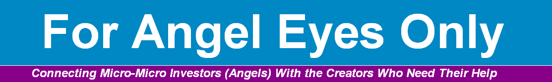 | Welcome to For Angel Eyes Only, the print, digital and video magazine that seeks to connect micro-micro investors with the entrepreneurs and creator who need them. We've launched a Kickstarter campaign of our own to get the funds that will help us publish the print and digital (on the web) magazine - which will focus on the micro-micro investor and the joy and sense of fulfillment they get from helping out others. The video magazine focuses on crowdfunding campaigns that we think our readers will want to help. Check out the various categories below to find projects you'd like to hlep succeed. Click on a category to be taken to a page that lists selected campaigns. |